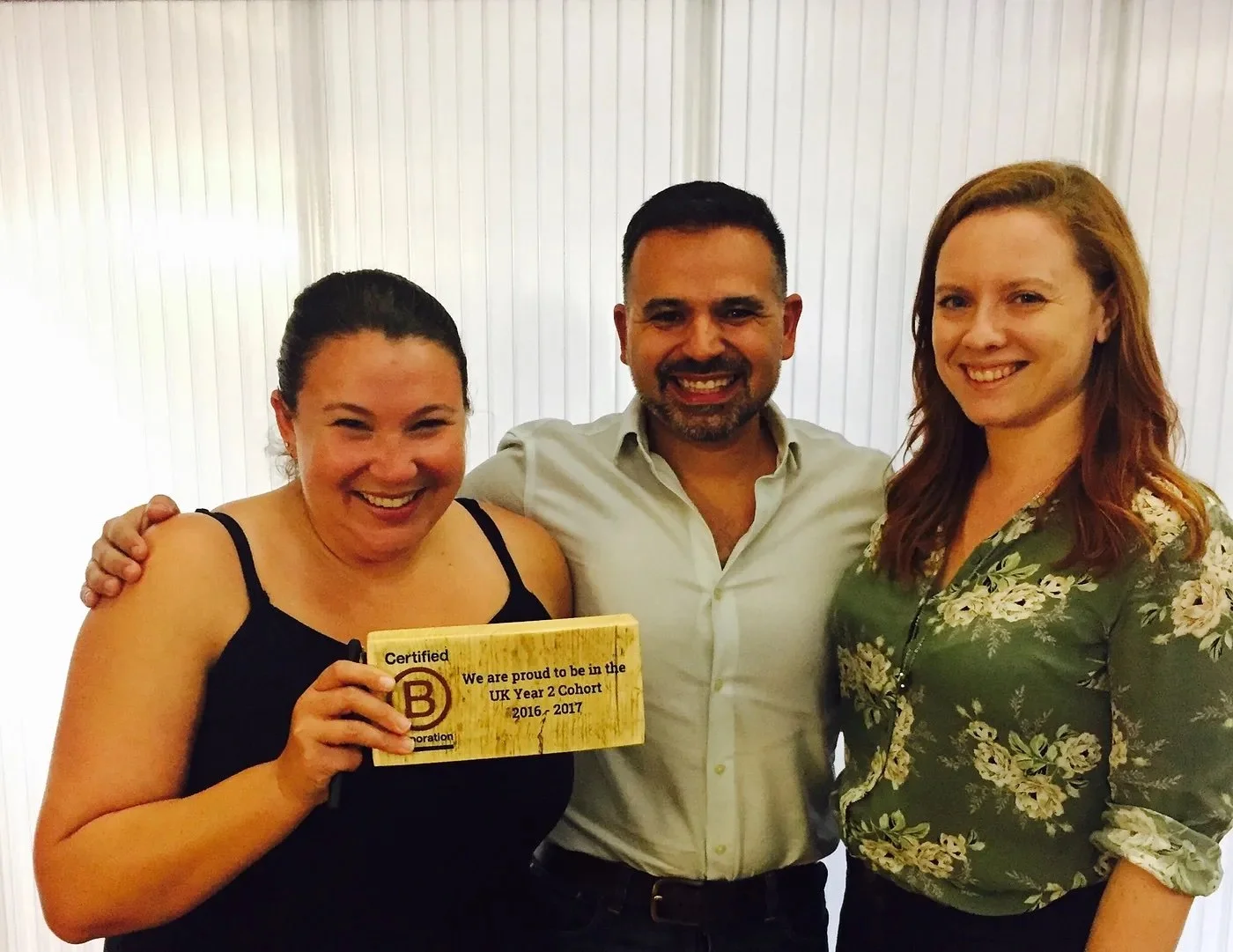Our MD Alisha, CEO Carlos and Advisor Emily with our B Corp plaque from B Lab UK
